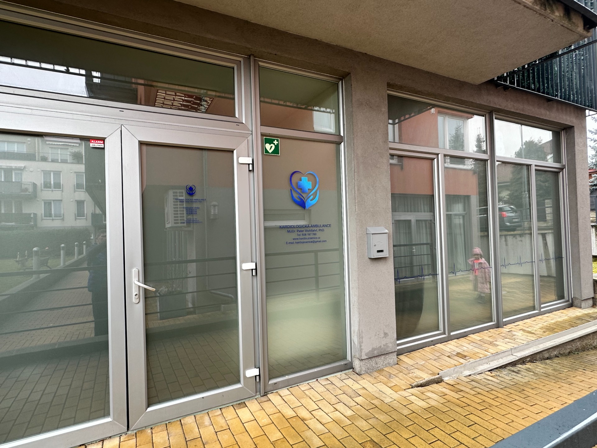 Přejděte po pravé straně bývalé lékárny. Ambulance je v zadní části domu.